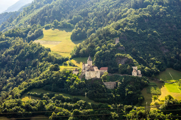 Blick auf die Altstadt von Klausen, auf die Burg Branzoll und auf Kloster Säben.