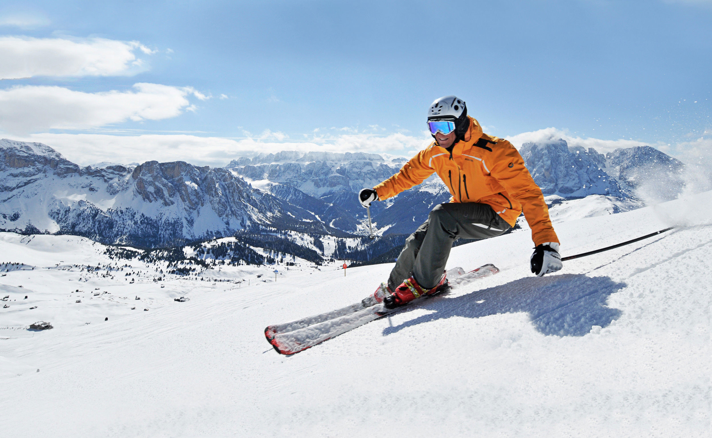 Traumhaft sonnige Pisten und herrliche Ausblicke auf die Bergwelt der Dolomiten bieten die Skipisten in Gröden.
