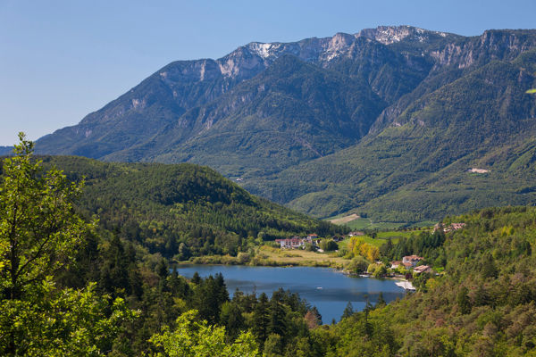 Der See liegt eingebettet in eine Wald- und Hügellandschaft bei Montiggl.