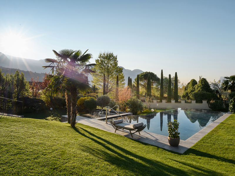Sonnenverwöhnte Waalwege, mediterrane Gärten und alpine Gipfel: Mitten in den Obstgärten von Algund bei Meran verbindet dieser Rückzugsort mediterranes Flair mit alpiner Weite. Die ruhige Panoramalage im Herzen des Meraner Lands öffnet den Blick zur Texelgruppe; die Kurstadt Meran mit Lauben, Promenaden und saisonalen Märkten ist in wenigen Minuten erreichbar. Der Algunder Waalweg und der Tappeinerweg machen jeden Tag zum sanften, aussichtsreichen Naturspaziergang.