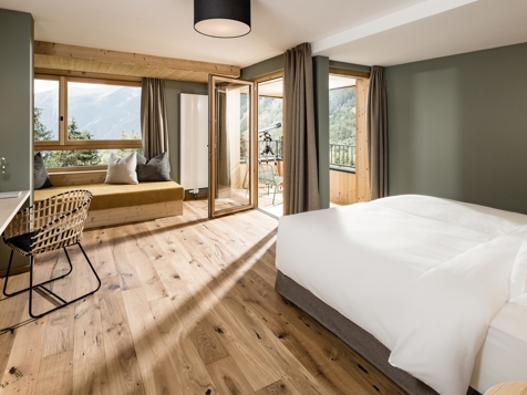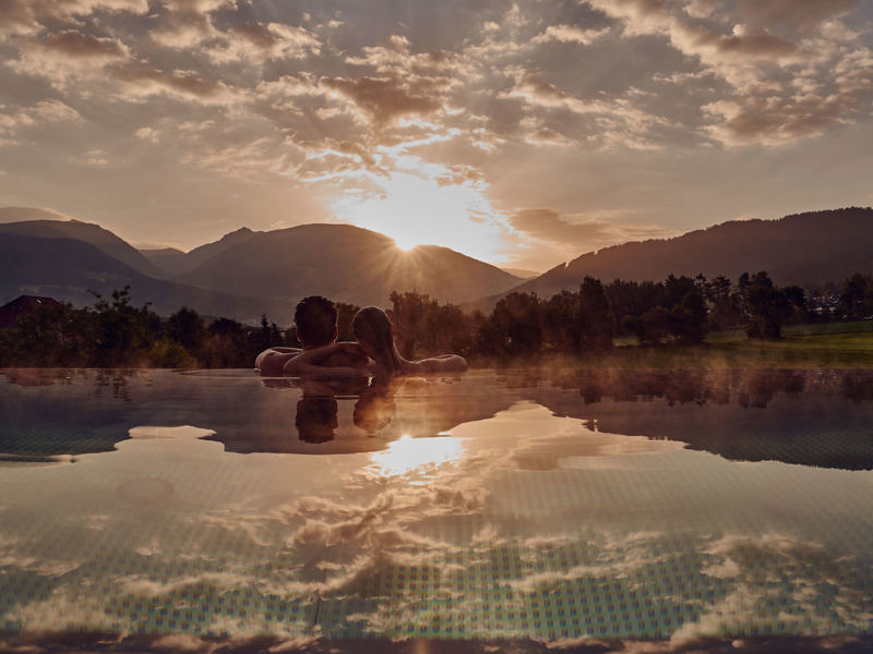 Die Gäste genießen eine regionale ¾-Genusspension mit abwechslungsreichem Frühstück, Nachmittagsjause („Marende“) und kreativem Gourmet-Menü am Abend. Im 1.000 m² großen Acquapura SPA erwarten Sie beheizter Innen- und Außenpool, verschiedene Saunen (Finnisch, Bio, Dampfbad), Kneipp-Becken, Vitalbar und individuelle Massagen sowie Kosmetikbehandlungen. Ein moderner Fitnessraum ergänzt das Angebot, dazu gibt es eine Wellness-Tasche mit Bademantel, Handtüchern und Slippern auf dem Zimmer.