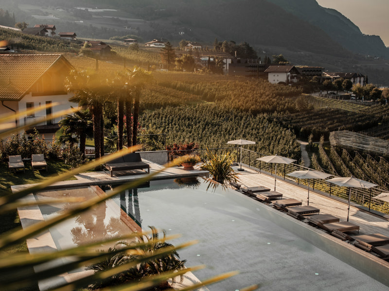 In der großzügigen Anlage mit nur 32 Zimmern und Suiten genießt man absolute Ruhe und einen spektakulären Blick über das Meraner Land. Die modernen, lichtdurchfluteten Zimmer und großzügige Suiten mit Whirlpool laden zum Träumen ein. Regional, saisonal, hausgemacht: hier wird großer Wert auf die gehobene Küche gelegt. Die kulinarischen Köstlichkeiten werden im Restaurant oder auf der Terrasse serviert und von erlesenen Weinen begleitet. Am Morgen genießen Sie ein reichhaltiges Frühstücksbuffet, und am Nachmittag werden hausgemachte, traditionelle Süßspeisen serviert.