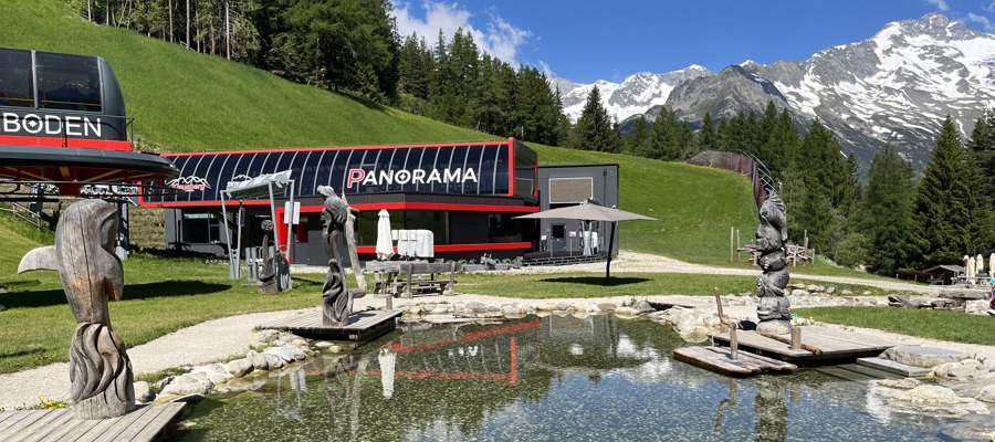 Blick auf die Aufstiegsanlagen im Sommer, mit den Cirspitzen im Hintergrund