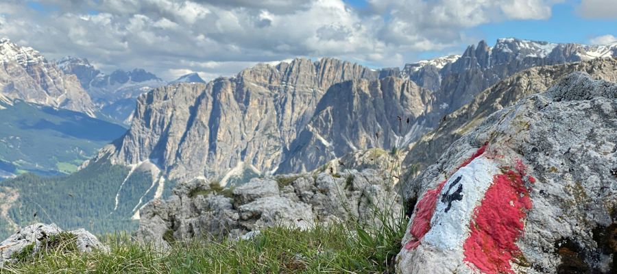 Schöne Frühlingswanderung mit Blick auf Zehnerspitze und Heiligkreuzkofel-Gruppe.