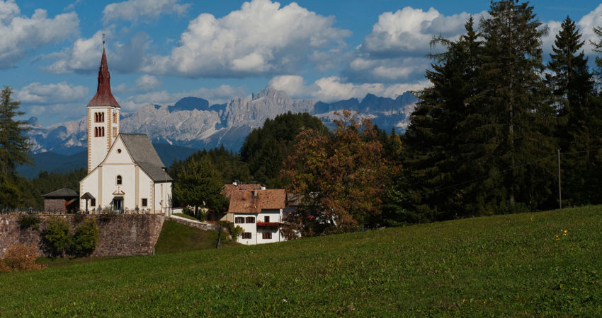 Petersberg liegt zwischen Rosengarten und Latemar, in der sagenhaften Welt der Dolomitenberge.