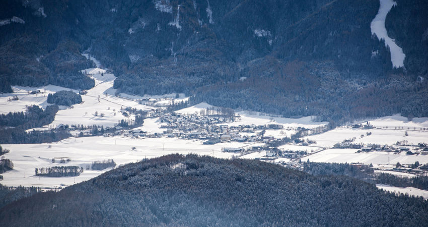 Blick von der Bergstation Bruneck auf Bruneck und das Tauferer Ahrntal